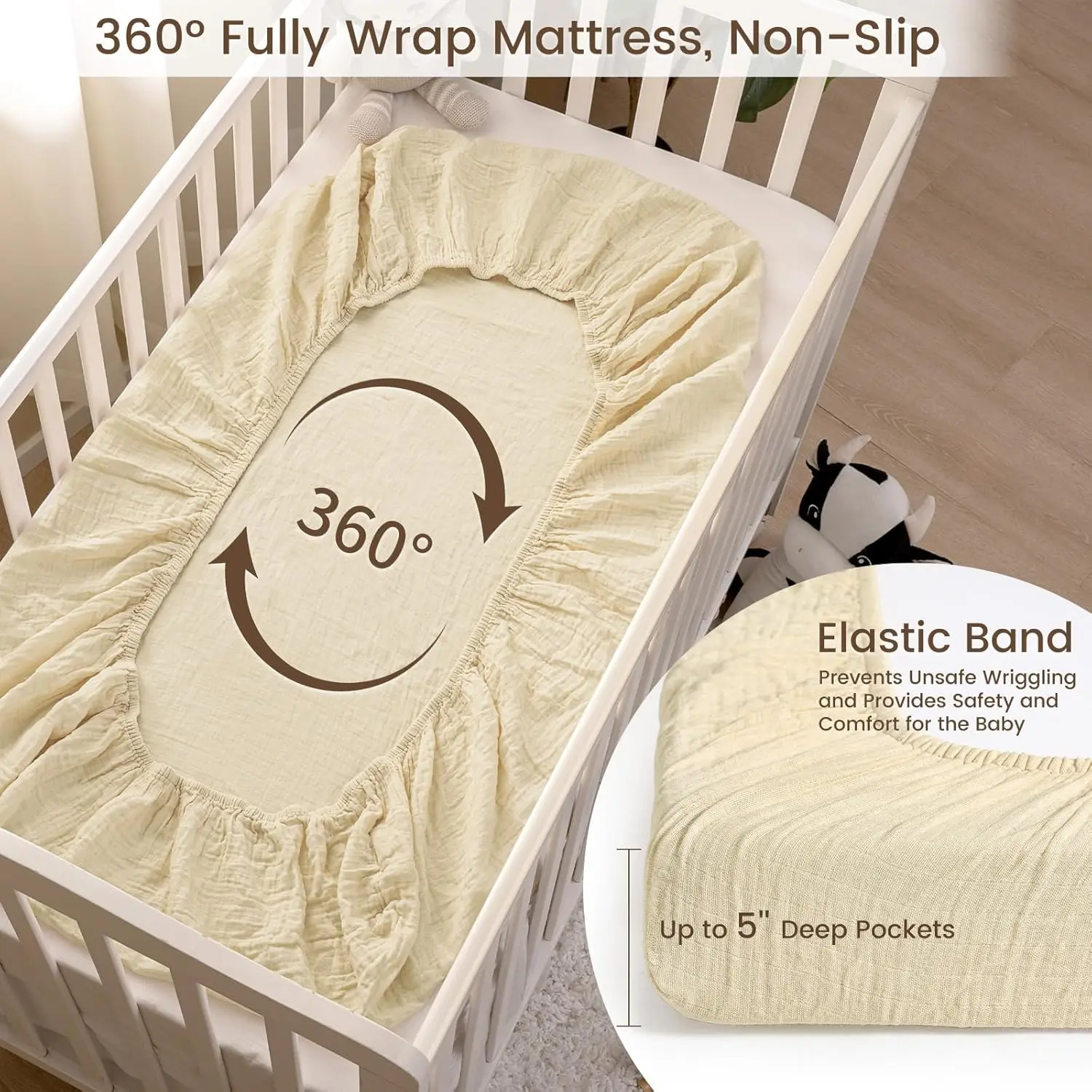 Discover the perfect bedding solution for your baby's comfort and safety with our premium muslin cotton mini crib sheets. Designed to enhance your shopping experience, these sheets offer exceptional quality and practicality. Key Features: - **100% Premium Muslin Cotton**: Crafted from high-quality muslin cotton, these sheets are ultra-soft, gentle, and skin-friendly, ideal for delicate baby skin. The two-layer construction ensures superior moisture absorption and breathability, helping to prevent overheating and keep your baby feeling refreshed and comfortable throughout the year. Perfect for summer use or any season. - **Perfect Fit Guarantee**: Stop worrying about compatibility! These mini crib sheets are specifically engineered to fit most mattresses ranging from 1" to 5" in thickness, including pack and play, play yard, playpen, and mini portable crib models. With a deep 5" pocket and a strong elastic band all around, the sheet stays securely in place without slipping or bunching up. - **Durable Design Details**: Featuring exquisite textile workmanship and a unique sewing process, these sheets have neat edges that are strong and wear-resistant. They maintain their integrity as your baby grows into a toddler. Manufactured under stringent processes in a high-standard environment to ensure long-lasting durability. - **Easy Care Instructions**: Caring for these sheets is simple! They are machine washable at low temperatures with gentle cycles. You don't have to worry about pilling, wrinkling, shrinking, or stretching after washing. In fact, they get softer with each wash while remaining colorfast even after multiple uses. - **Versatile Gift Option**: This pack includes two 100% muslin cotton mini crib sheets available in a wide range of colors suitable for both boys and girls. It makes an excellent gift choice for occasions like baby showers, christenings, birthday parties, or welcoming a newborn. Benefits: - Provides year-round comfort with enhanced breathability. - Ensures a snug fit on various mattress types without hassle. - Built to last through daily use as your child develops. - Maintains quality through easy maintenance routines. - Offers versatile gifting options for any celebration involving babies.