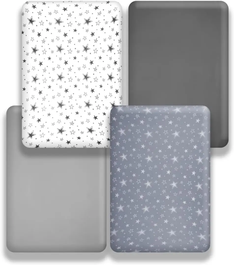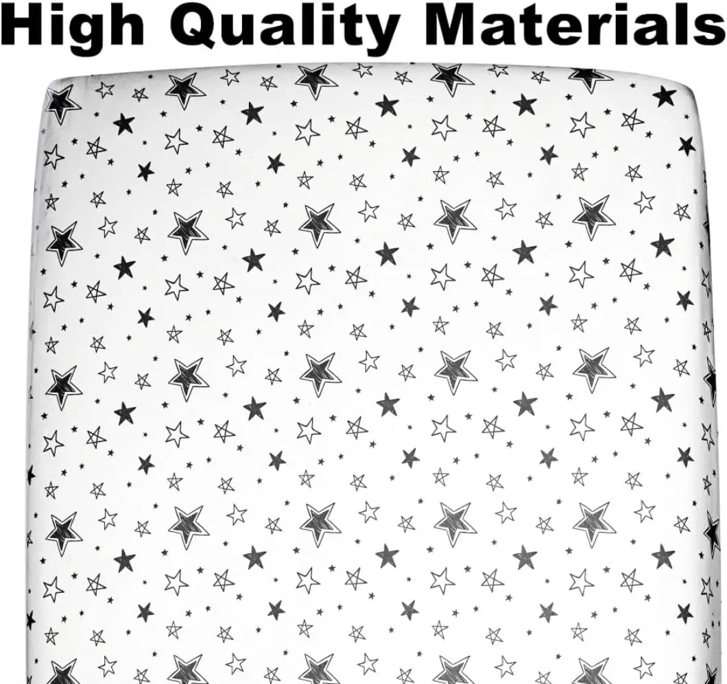 Enhance your baby's nursery with our versatile and comfortable crib sheets set. Designed to provide a cozy sleeping environment while adding a charming touch to any room decor. Key Features: - Neutral Star & Moon Design: Featuring gentle star and moon prints in soft, neutral colors that suit both baby boys and girls. This timeless pattern complements various nursery themes, from celestial to modern minimalist styles, allowing for easy coordination with existing bedding and room accessories. - Superior Comfort & Breathability: Crafted from high-quality, breathable materials that ensure optimal airflow. The fabric is soft against delicate skin, helping regulate temperature to keep your baby comfortable throughout the night without overheating or irritation. - Durable & Easy Maintenance: Made to withstand frequent use with colors that resist fading over time. The sheets are machine washable and dryable for convenient care, maintaining their vibrant appearance and soft texture through multiple washes without shrinking or pilling. - Perfect Fit & Secure Hold: Each sheet features a full elastic trim on all four sides, ensuring a snug fit on standard crib mattresses measuring 52 inches by 28 inches. This design prevents slipping or bunching up during sleep, providing a smooth surface that stays securely in place all night long. - Value 4-Pack Set: Includes four crib sheets in one purchase, offering excellent value for parents. Having multiple sheets allows for easy rotation during laundry days or quick changes due to spills, ensuring you always have a fresh sheet ready. Ideal for busy households or as a practical gift for new parents. Additional Benefits: The neutral color palette makes these sheets suitable for gender-neutral nurseries or shared spaces. The fitted design simplifies bed-making tasks while the breathable fabric promotes better sleep quality by reducing moisture buildup. Each sheet is carefully constructed to meet safety standards without harsh chemicals or allergens. Usage Tips: For best results, wash before first use with mild detergent. Tumble dry on low heat or air dry to preserve elasticity and color vibrancy. Pair with matching nursery items like blankets or pillows to create a cohesive look. This set combines functionality with aesthetic appeal, making it an essential addition to any baby's bedding collection.