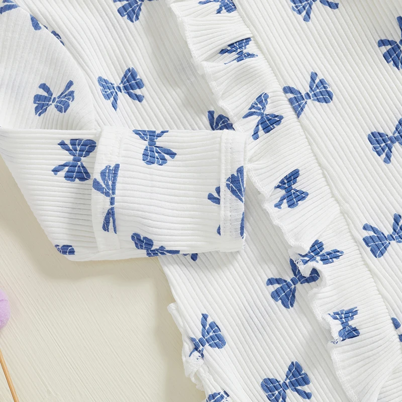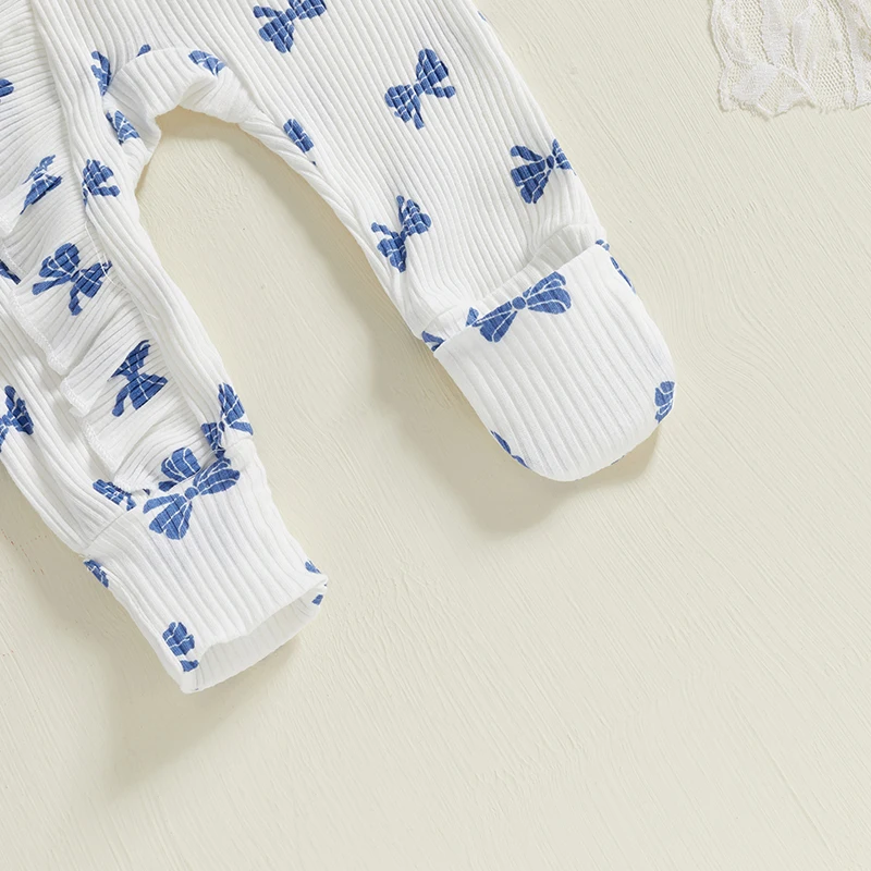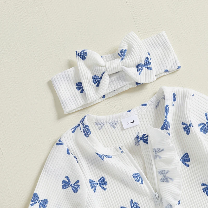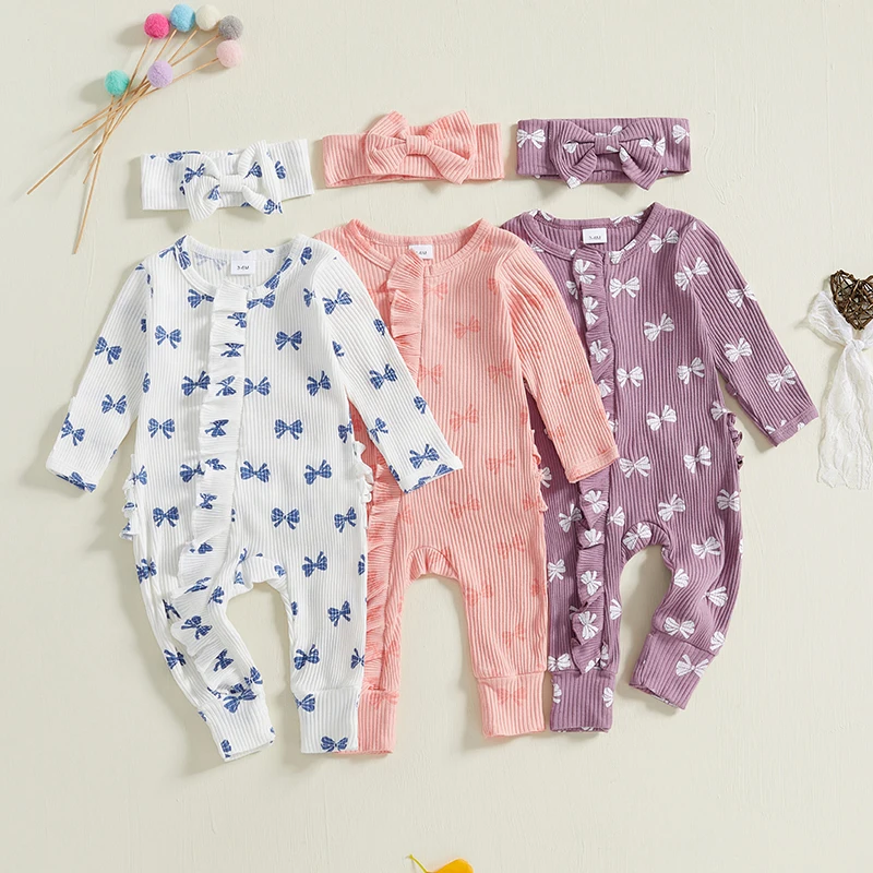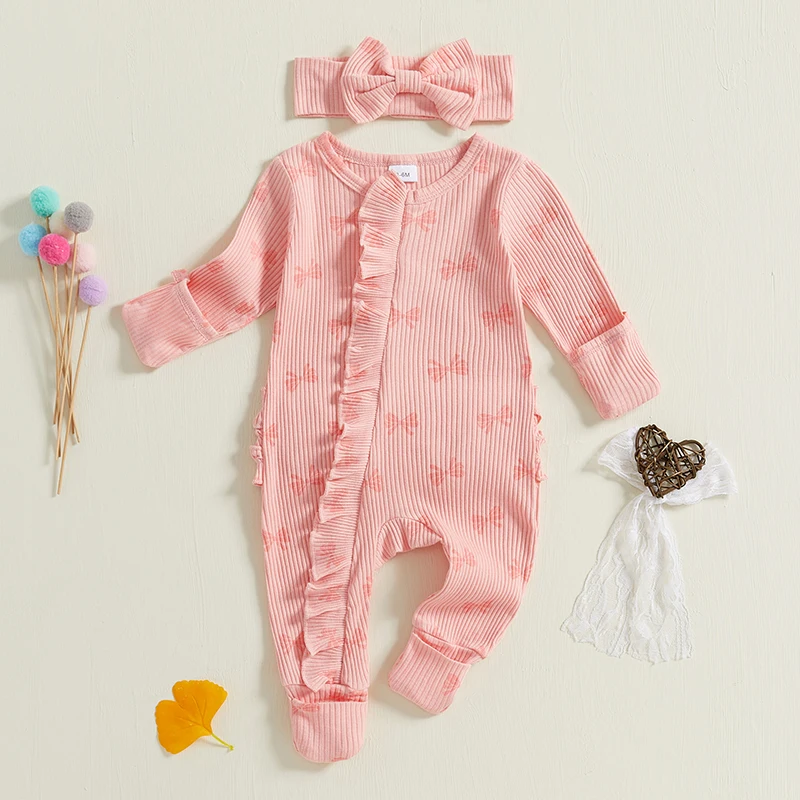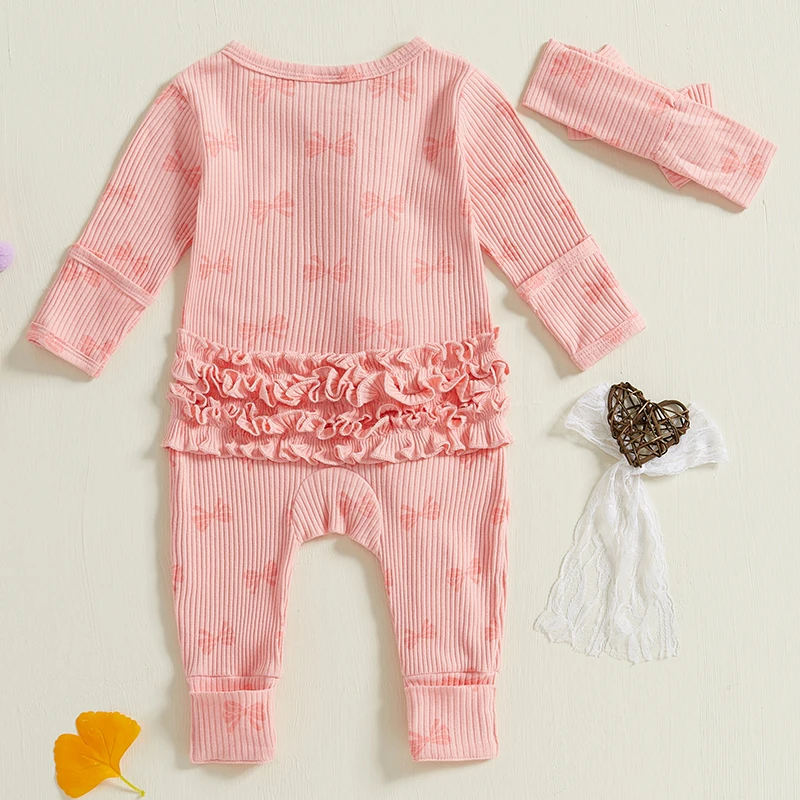 Baby Girl 2Pcs Fall Outfits Ruffle Long Sleeve Bow Print Jumpsuit with Headband Set Newborn Clothes