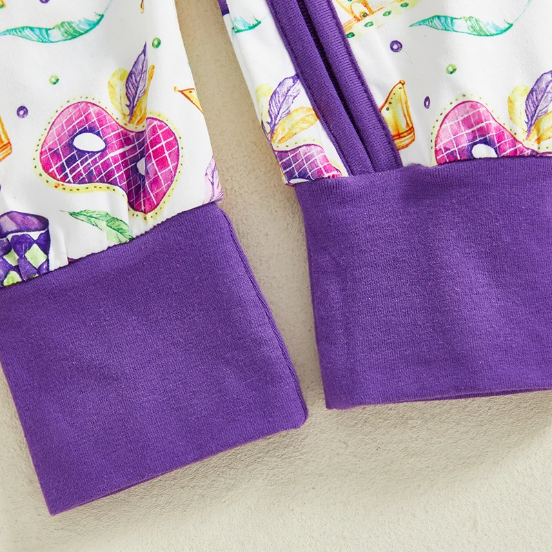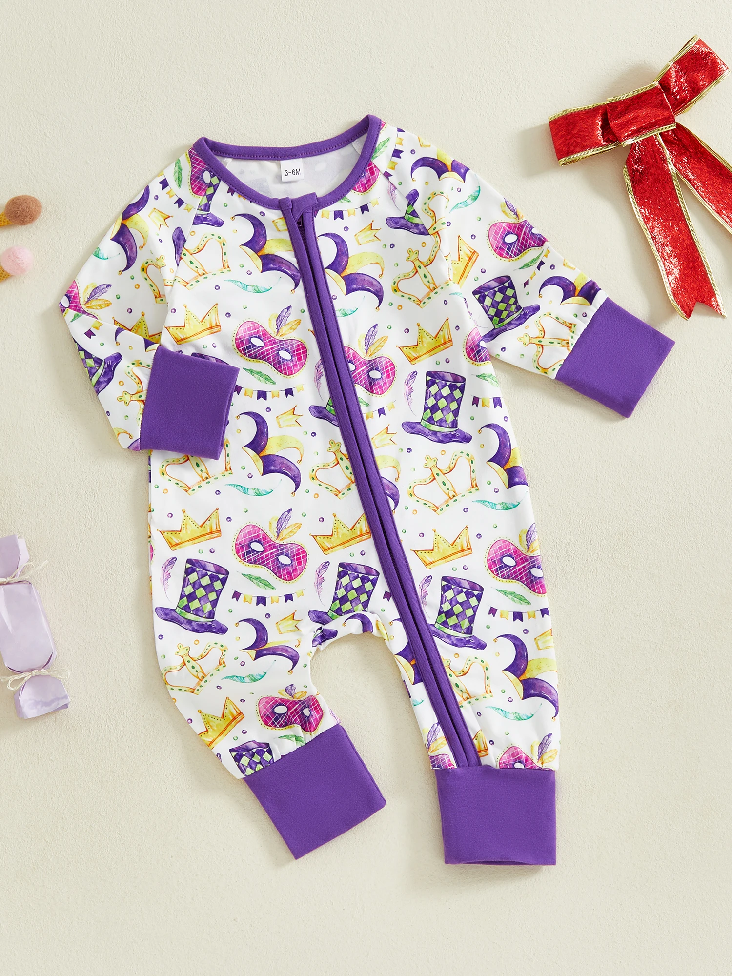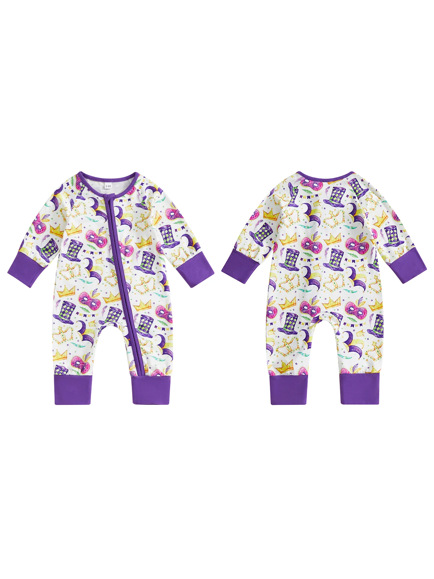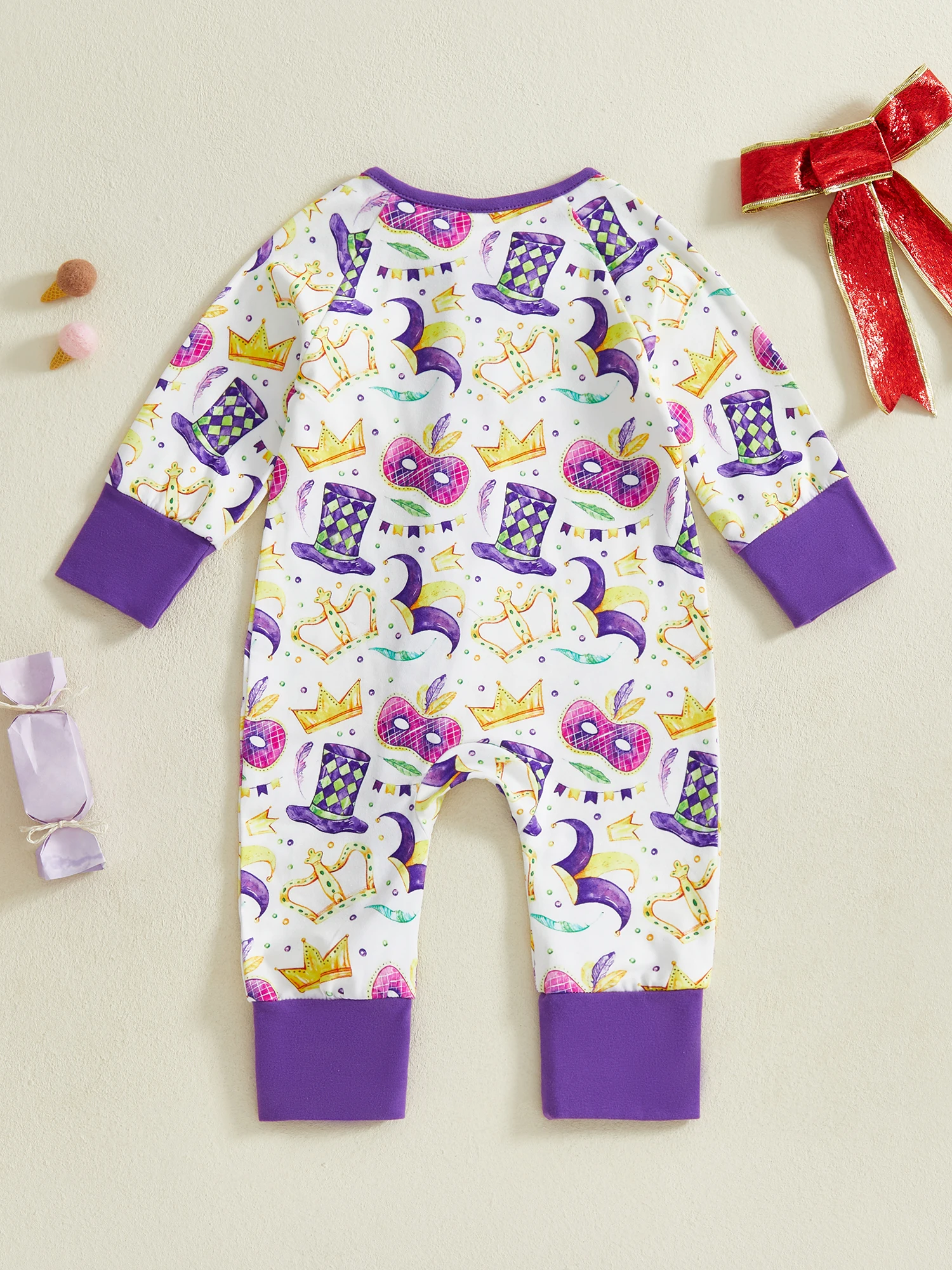 Baby Carnival Romper Hat Crown Print Long Sleeve Round Neck Zip Up Jumpsuit for Boys and Girls