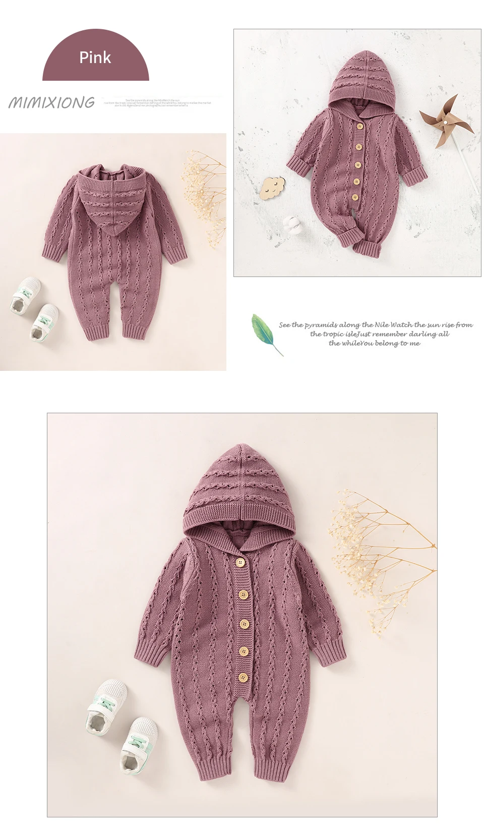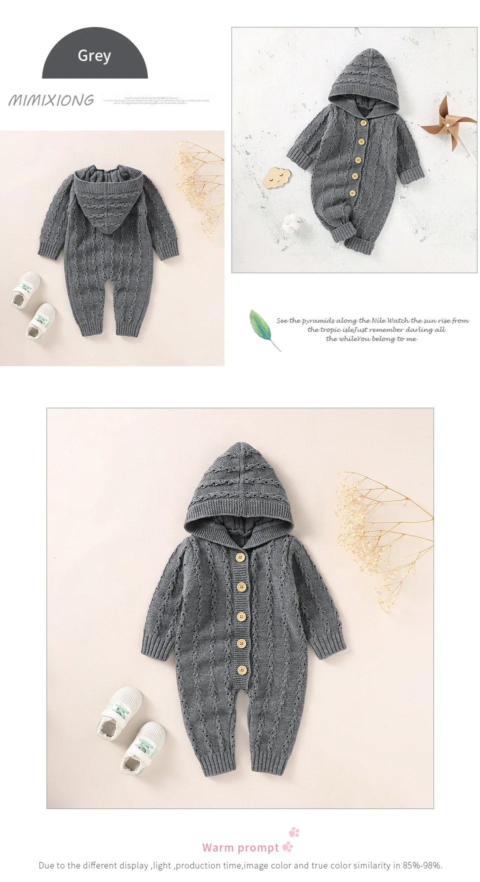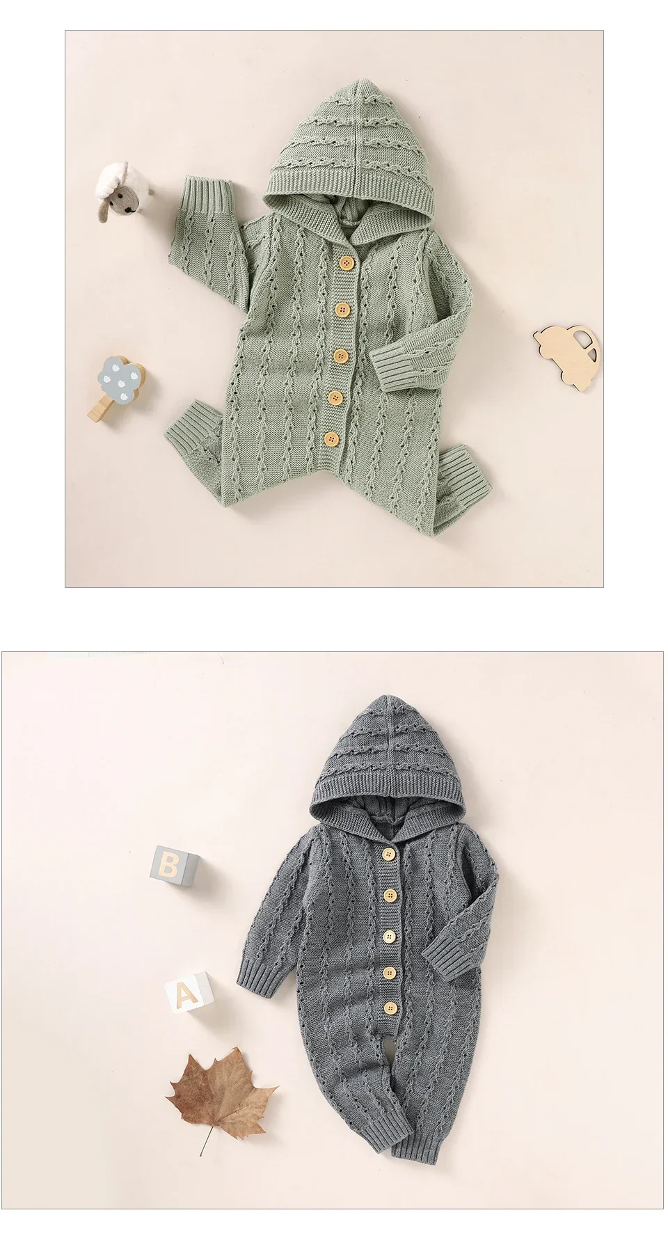 Autumn Winter Baby Knitted Hooded Rompers 0-18m, Long Sleeve Warm Jumpsuits for Infant Toddler Boys & Girls