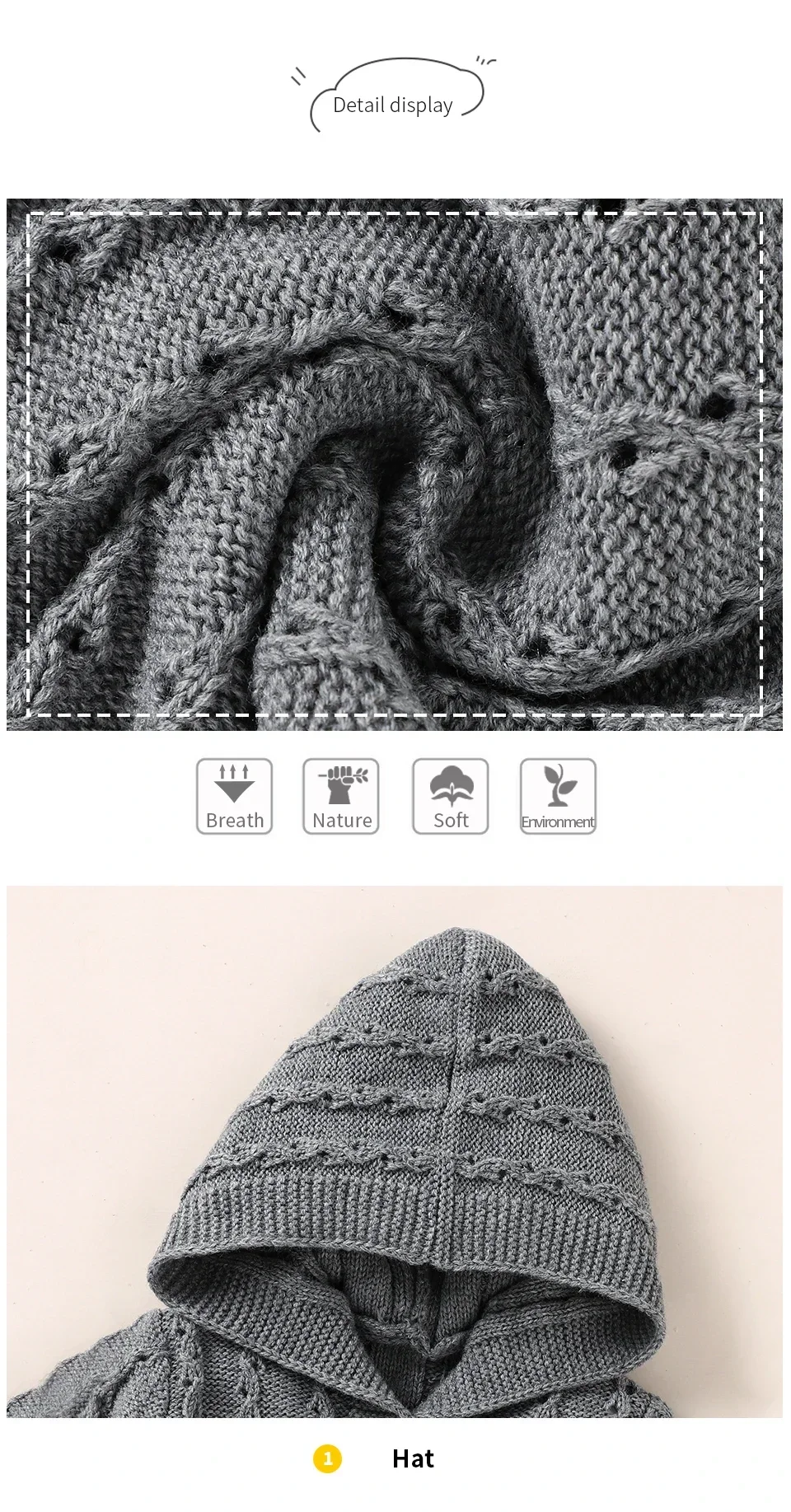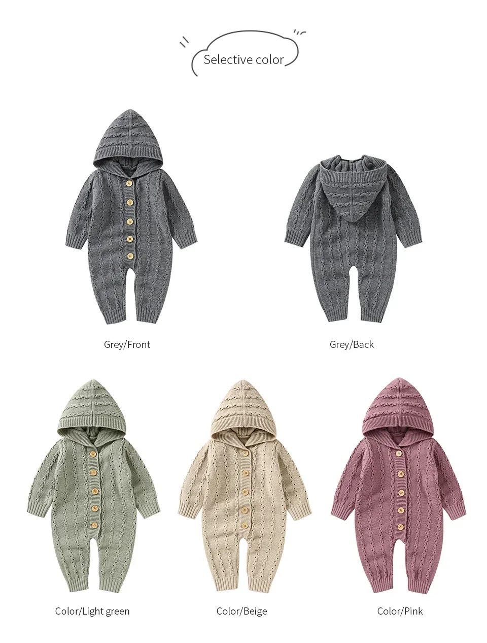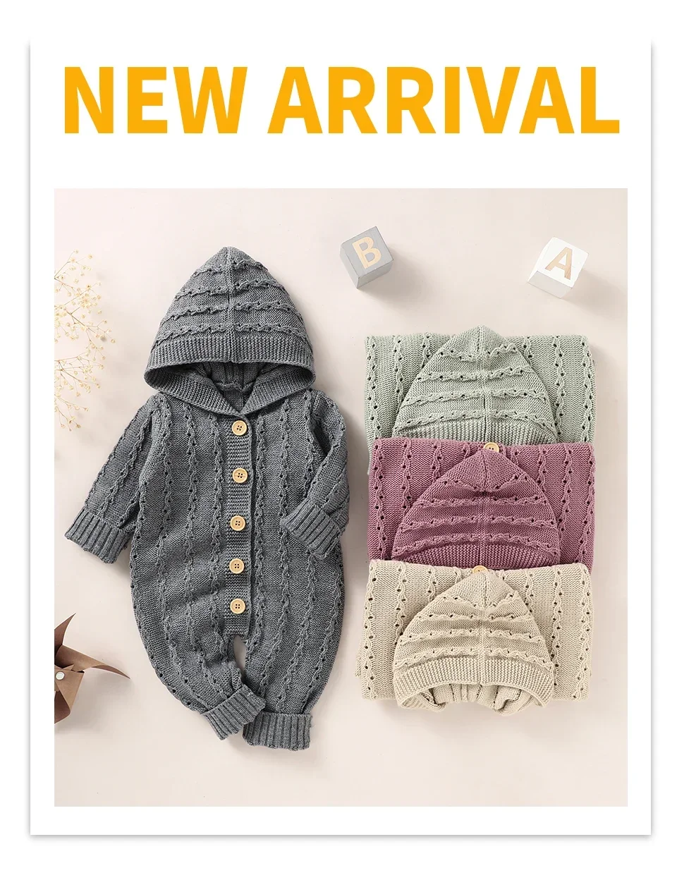 Autumn Winter Baby Knitted Hooded Rompers 0-18m, Long Sleeve Warm Jumpsuits for Infant Toddler Boys & Girls