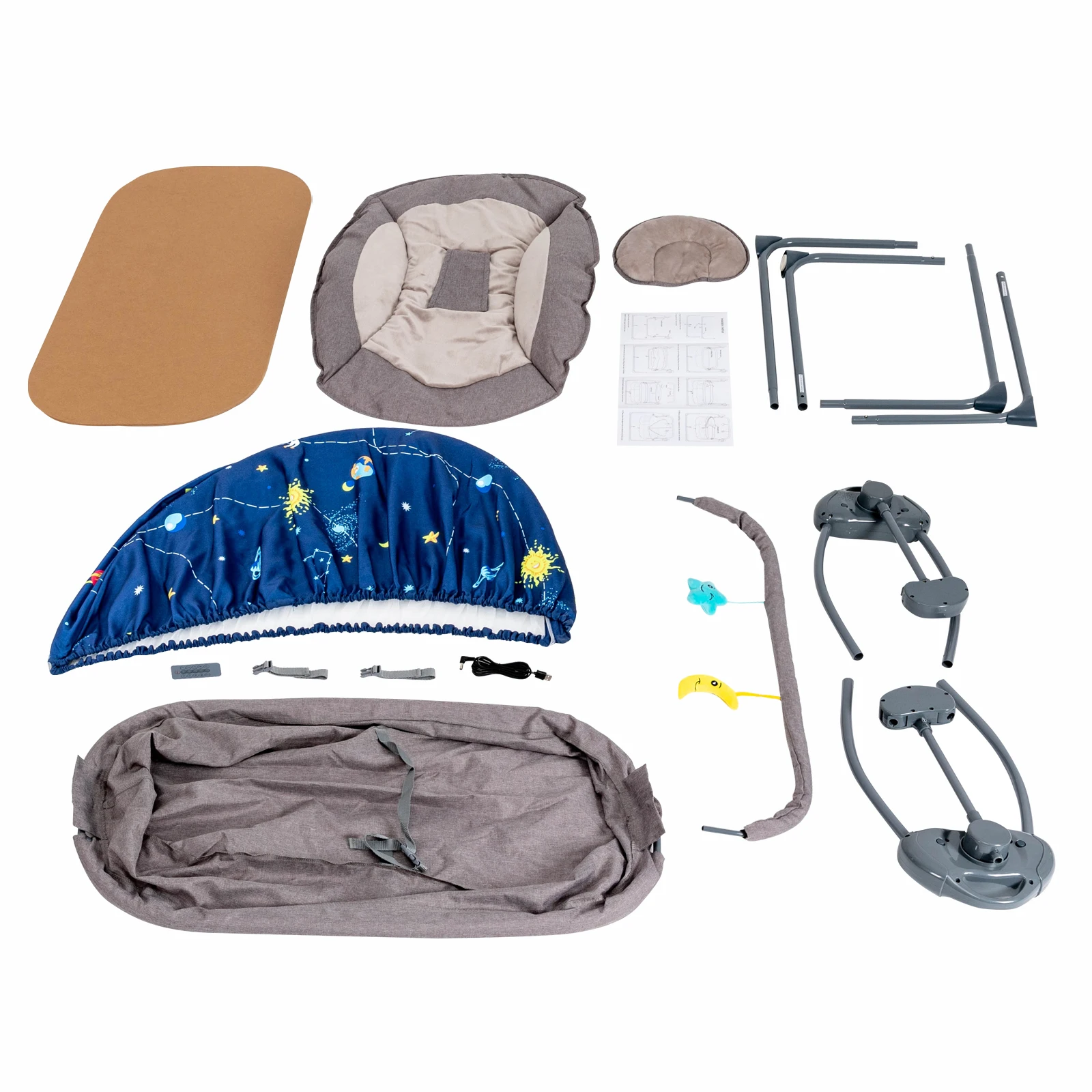 It can be used to coax your baby to sleep and quiet your crying baby indoors and outdoors. It is also suitable for playing and listening to songs and stories in this baby cradle swing.