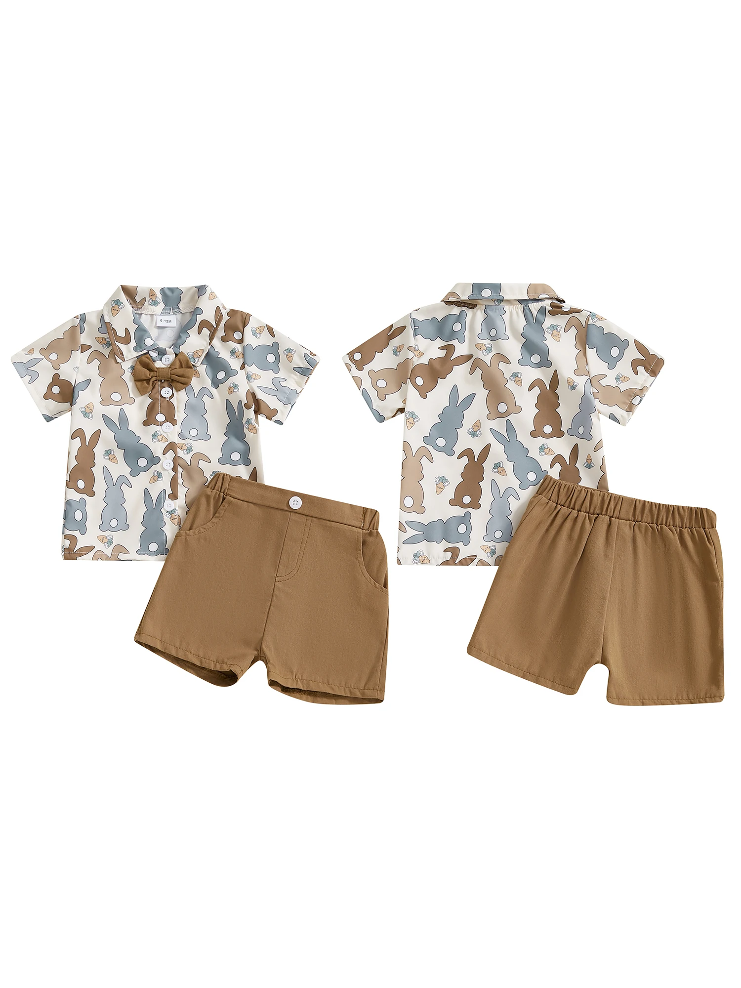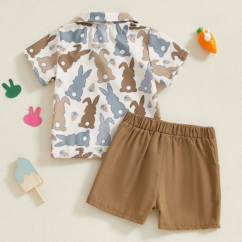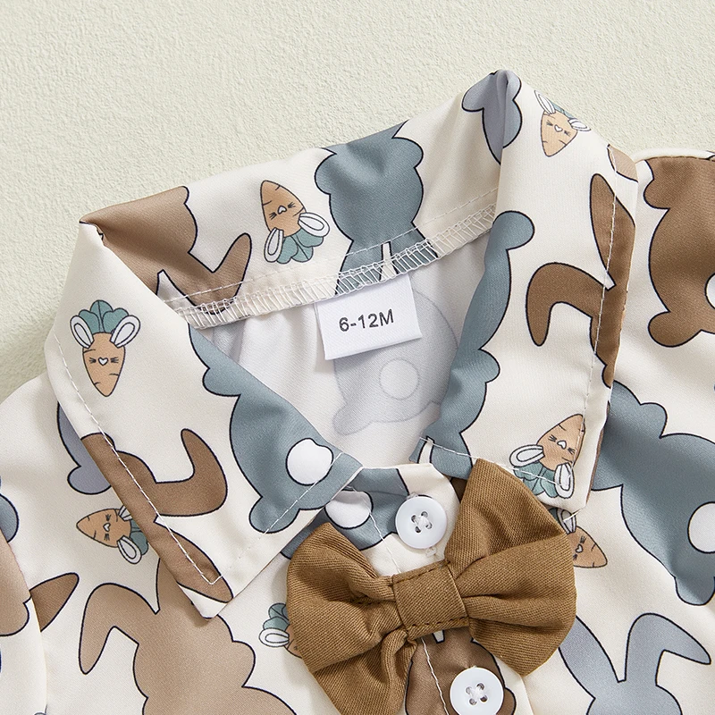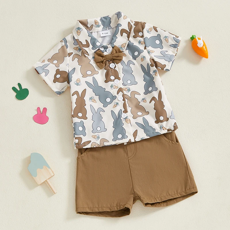 Toddler Boy Easter Shorts Set Bunny Print Short Sleeve Button-up Bow Tie Shirt Elastic Waistband Shorts