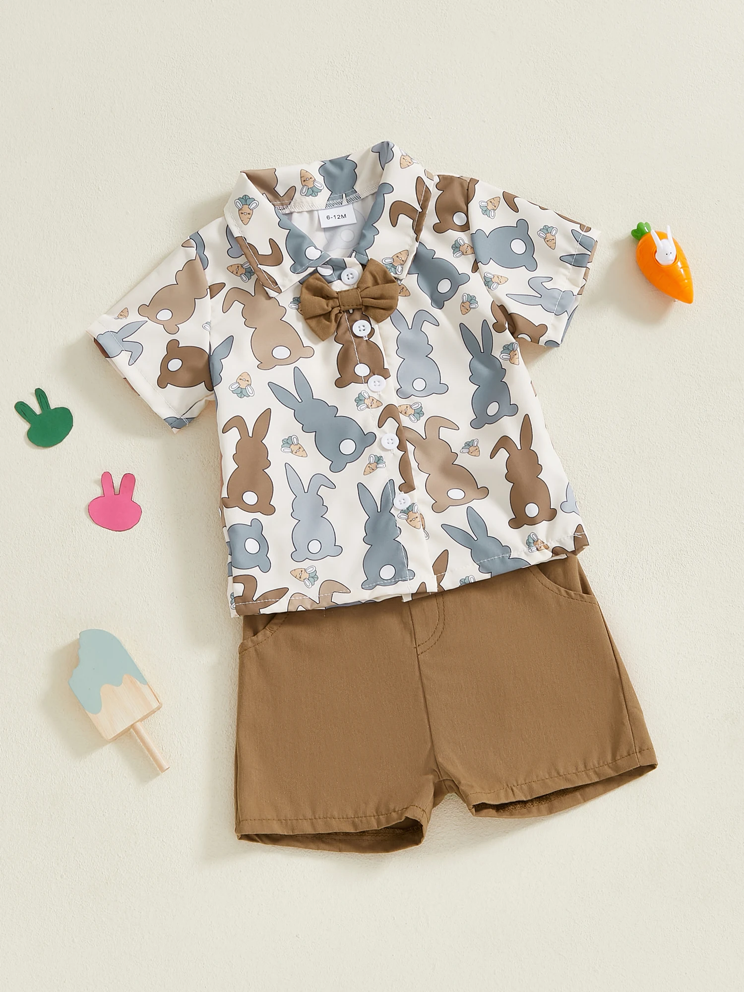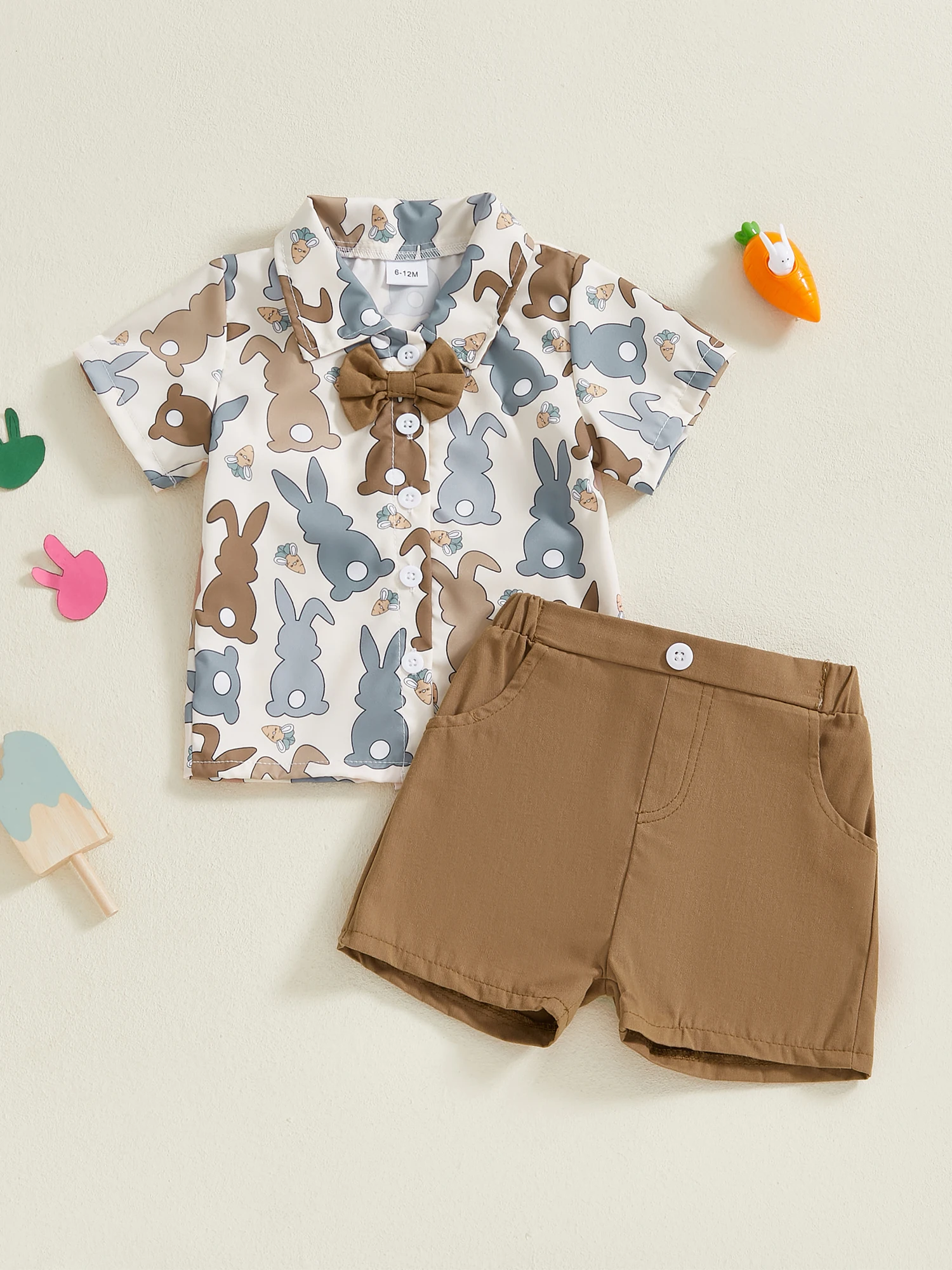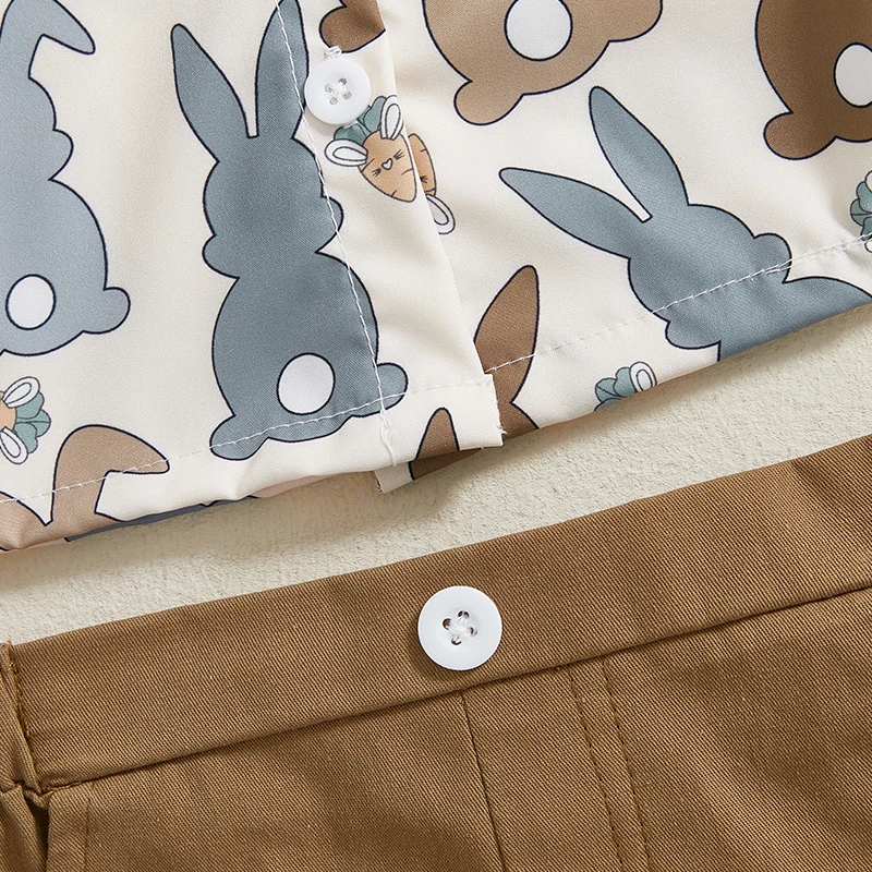 Easter Bunny Print Toddler Boy Short Sleeve Shirt and Shorts Set with Button-up Bow Tie and Elastic Waistband