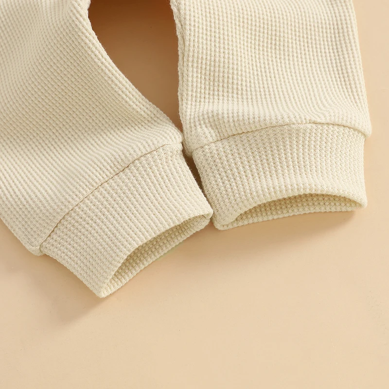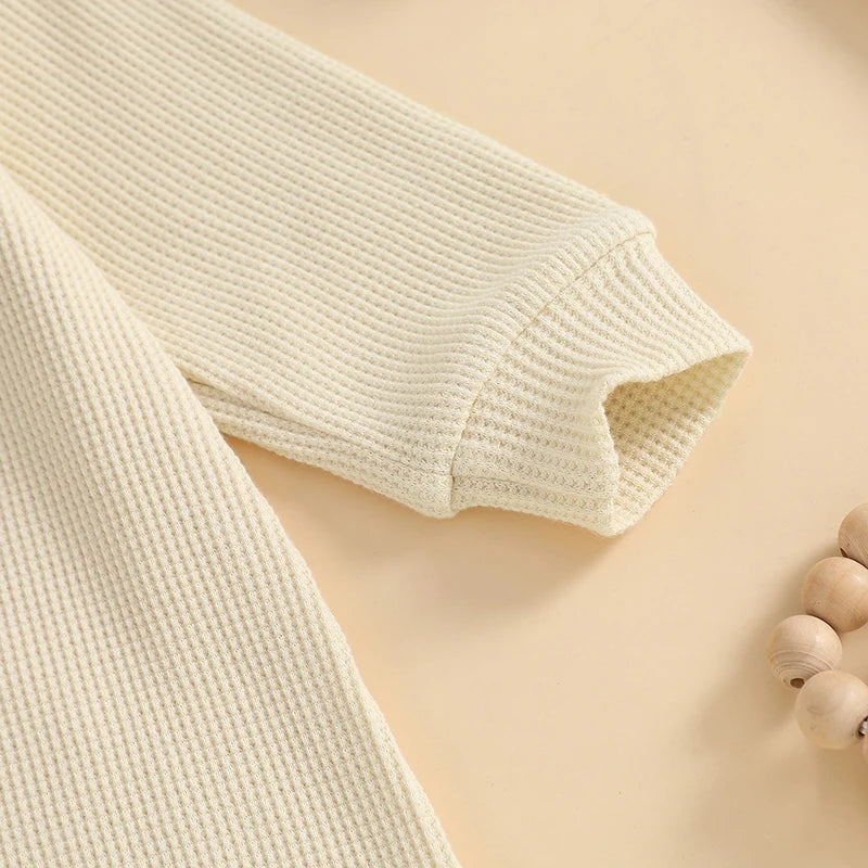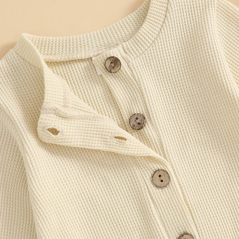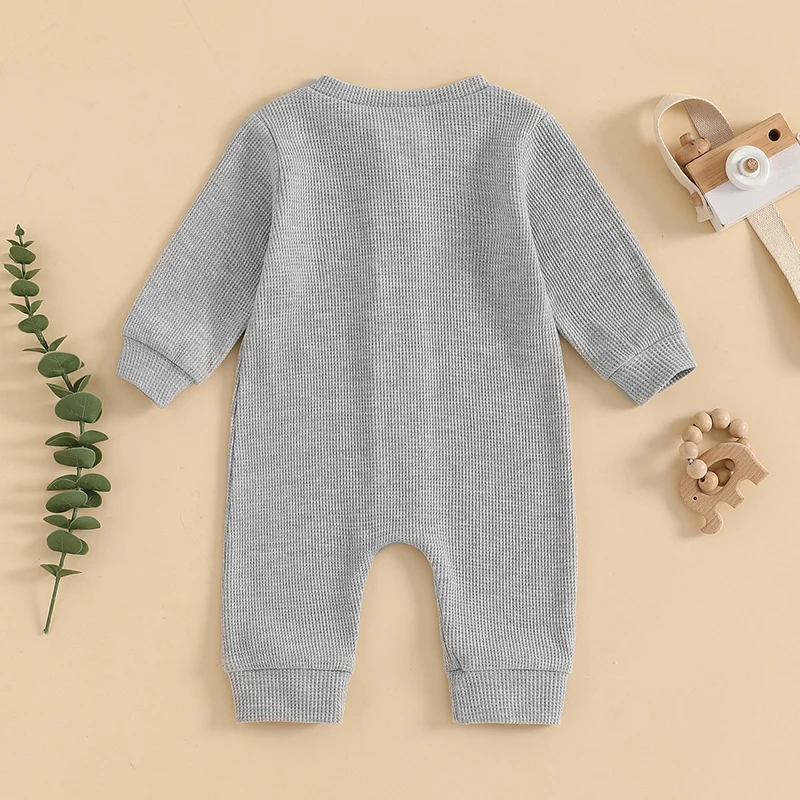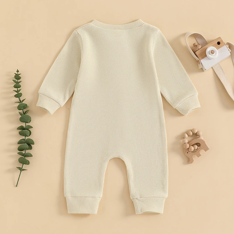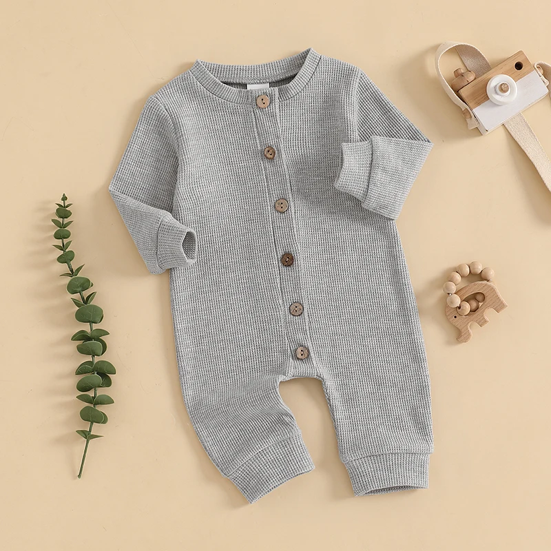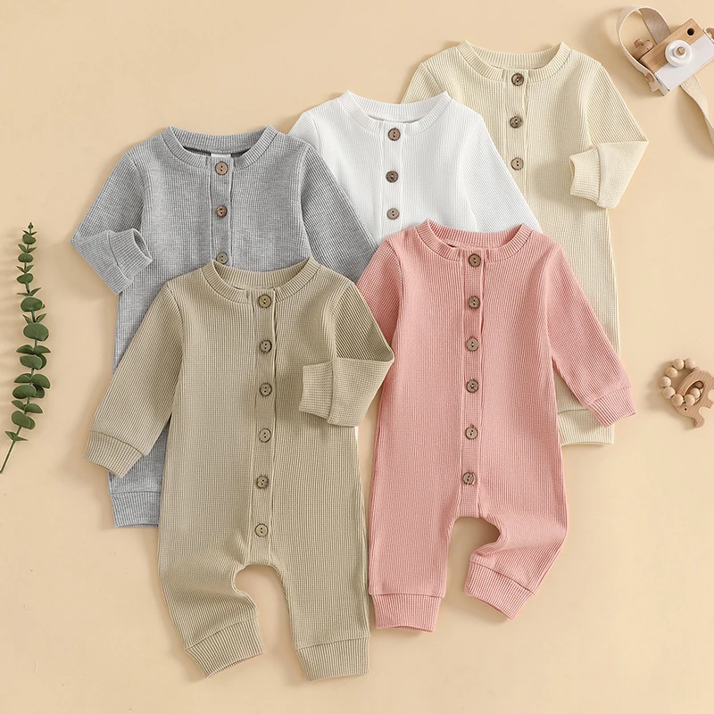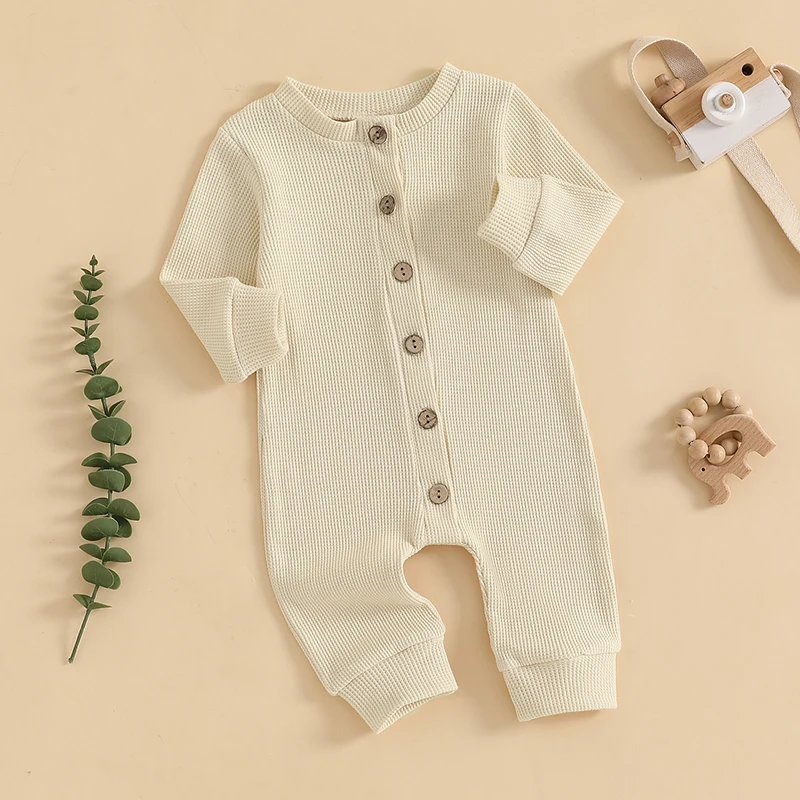 Baby Girl Boy Fall Romper Solid Color Waffled Long Sleeve Crew Neck Button Down JumpsuitSize (cm)