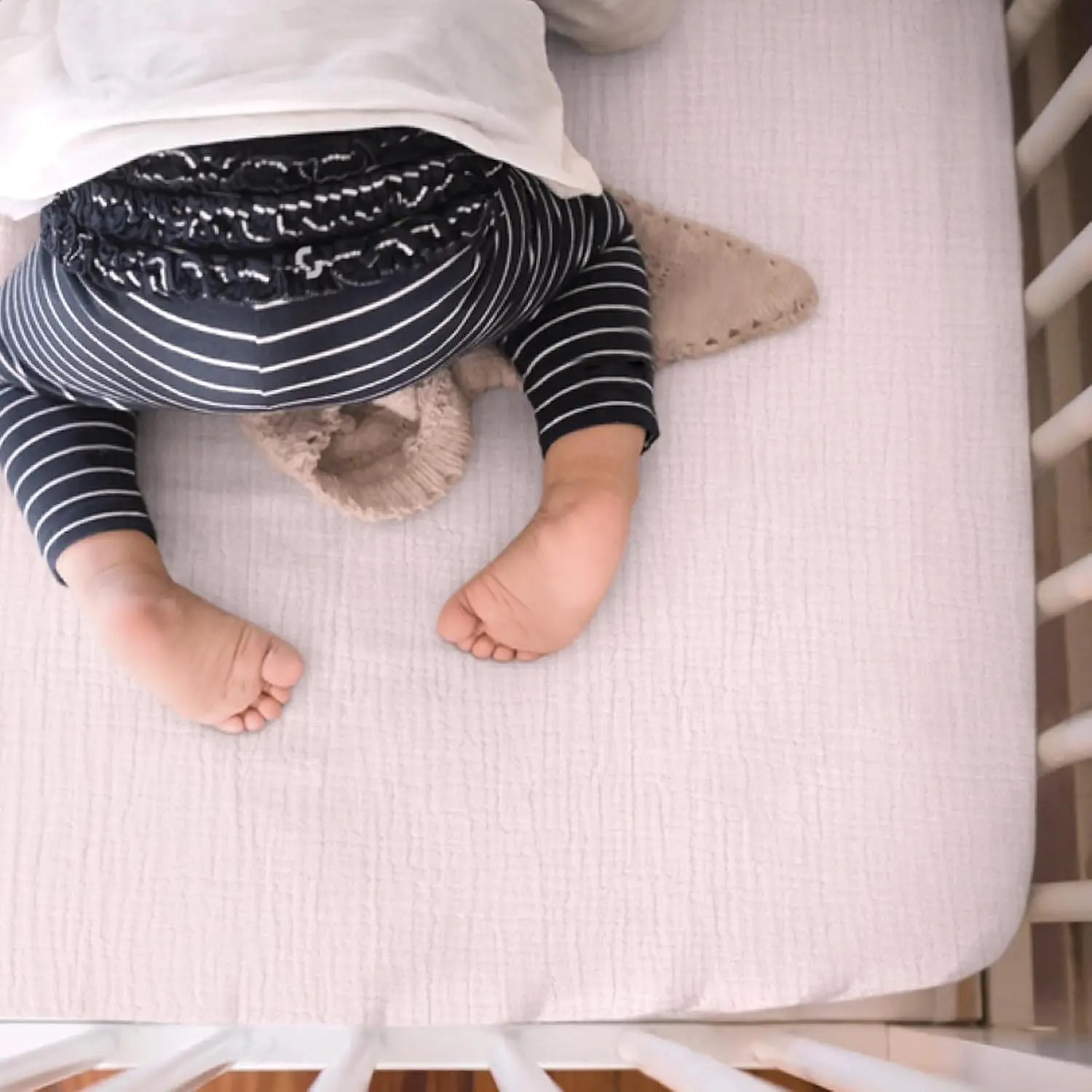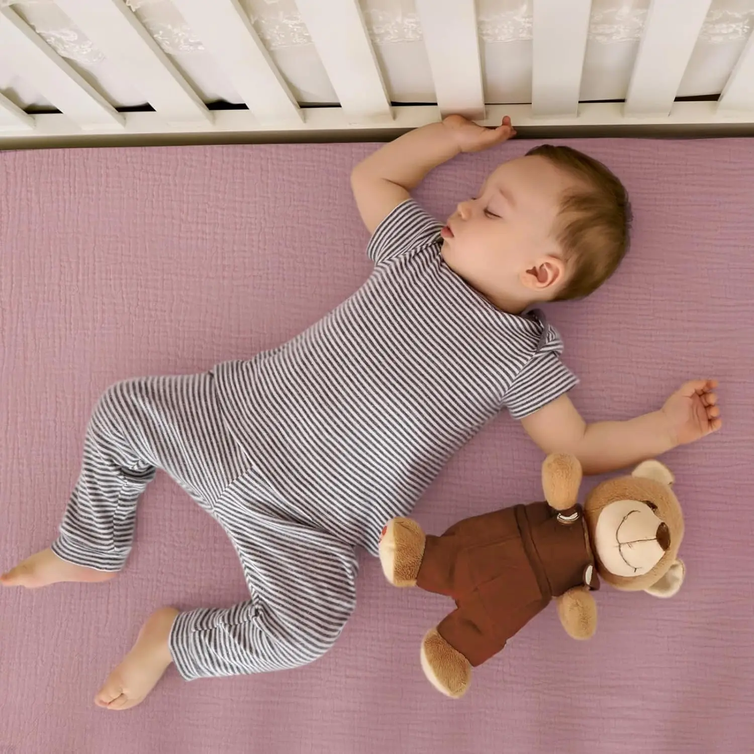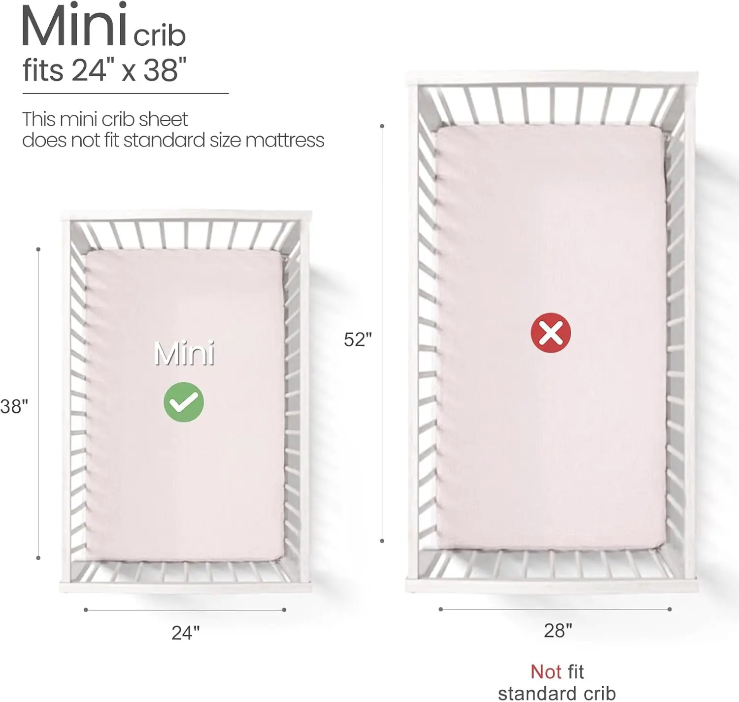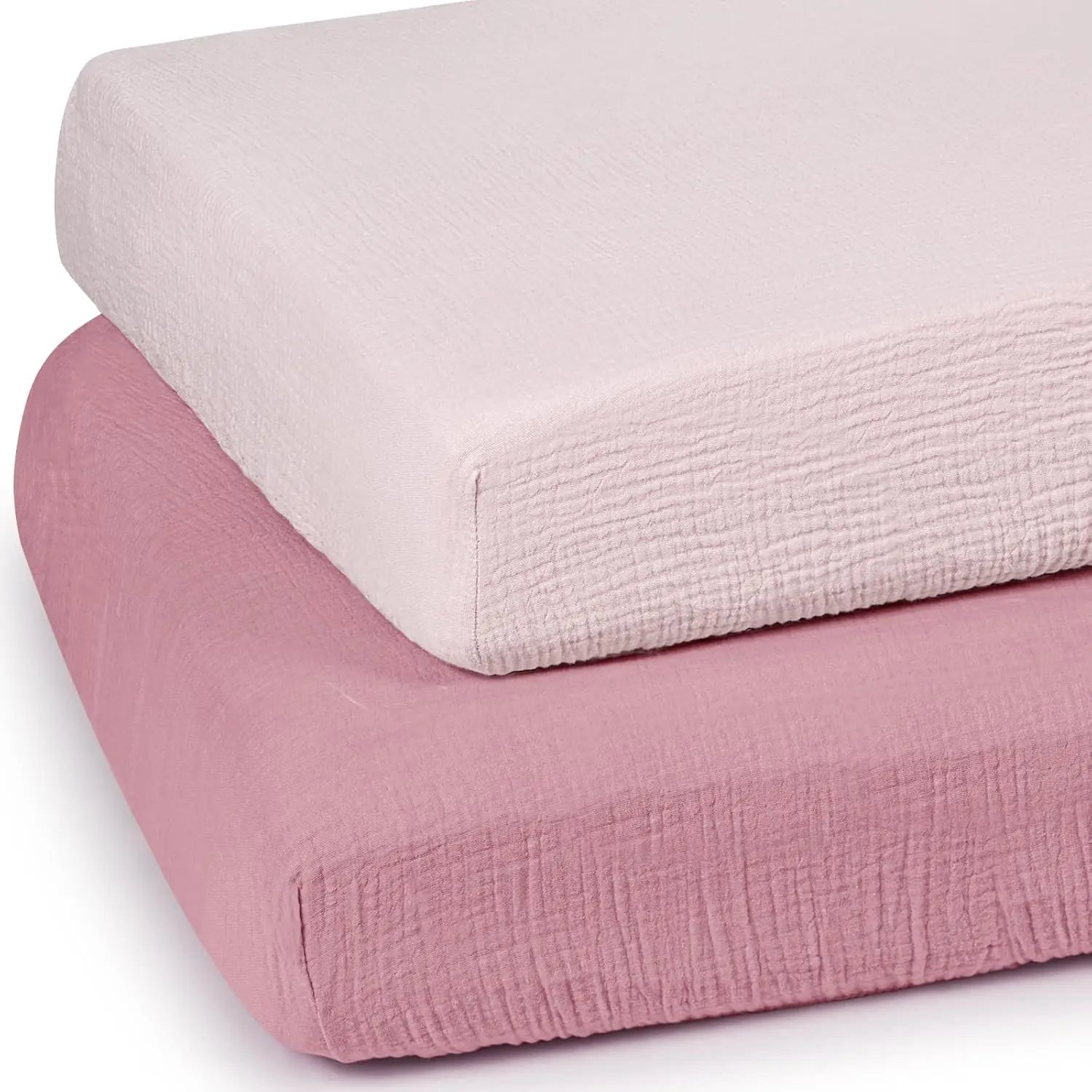 Discover our premium mini crib sheets designed to provide comfort and convenience for your baby's sleep. Made from soft, breathable cotton muslin fabric, these sheets offer a cozy and safe sleeping environment, helping babies transition smoothly from arms to crib. Key Features: - Material: Crafted from high-quality cotton muslin that is gentle on baby's skin, ensuring breathability and softness for a restful sleep. - Perfect Fit: Specifically designed to fit mini crib mattresses with precise sizing for a snug fit in all corners; not compatible with standard-size mattresses. - Secure Design: Features a fitted elastic edge with extra stretch to keep the sheets securely in place, preventing detachment and bunching during use. - Easy Maintenance: Machine washable on delicate cycle; the sheets become softer with each wash, maintaining quality over time. The 2-pack set ensures you always have a spare sheet handy for busy parents. - Versatile Gift Option: Ideal as a baby registry gift or nursery essential, available in multiple colors to match various nursery themes for both boys and girls. Benefits: - Enhances baby's comfort with soft, breathable fabric that promotes better sleep. - Provides peace of mind with a secure fit that reduces risks of loose bedding. - Simplifies care routines with easy washing instructions that preserve fabric quality. - Offers great value as a practical gift or addition to any nursery setup. Usage Tips: 1. Wash before first use on delicate cycle to ensure maximum softness. 2. Ensure mattress size matches mini crib specifications for optimal fit. 3. Rotate between the two sheets in the pack for extended durability and convenience.