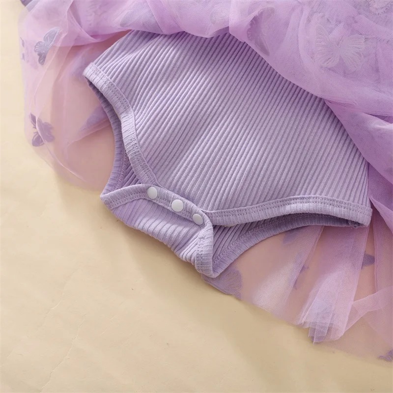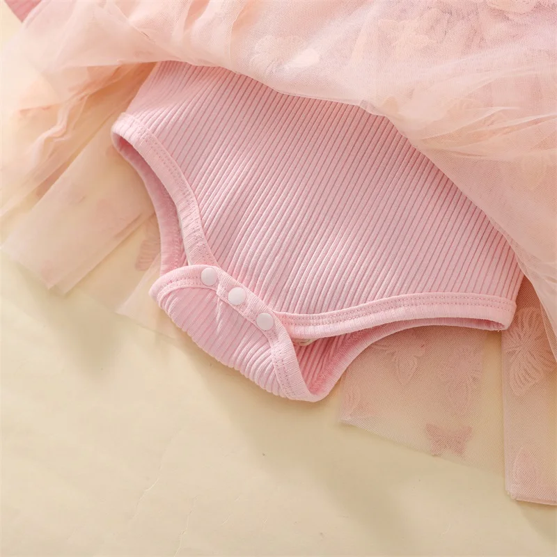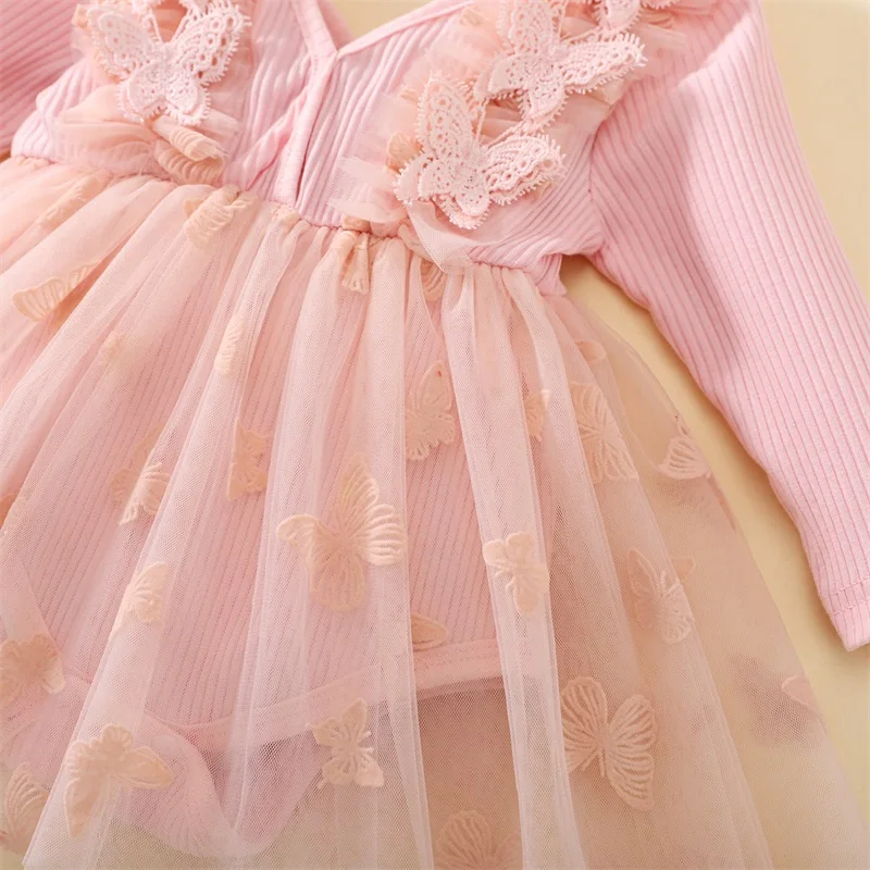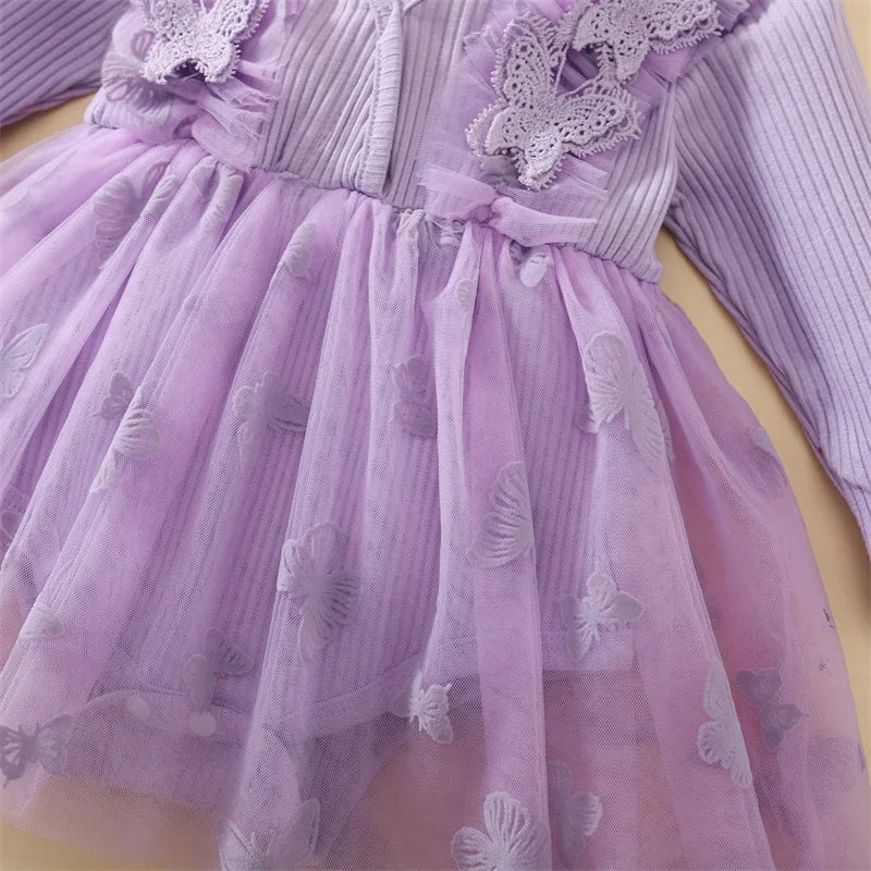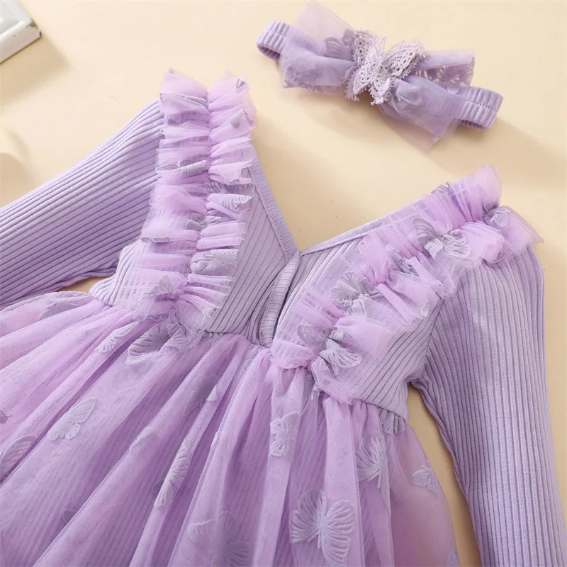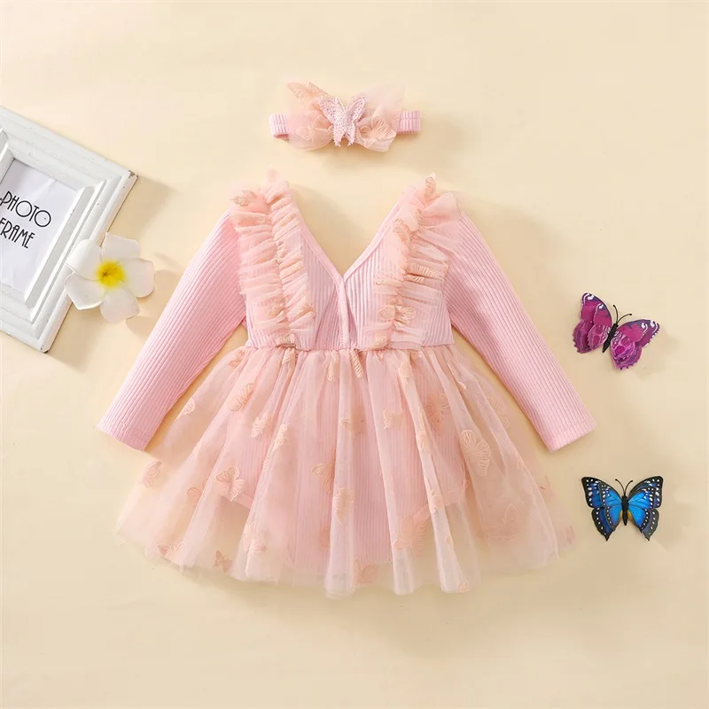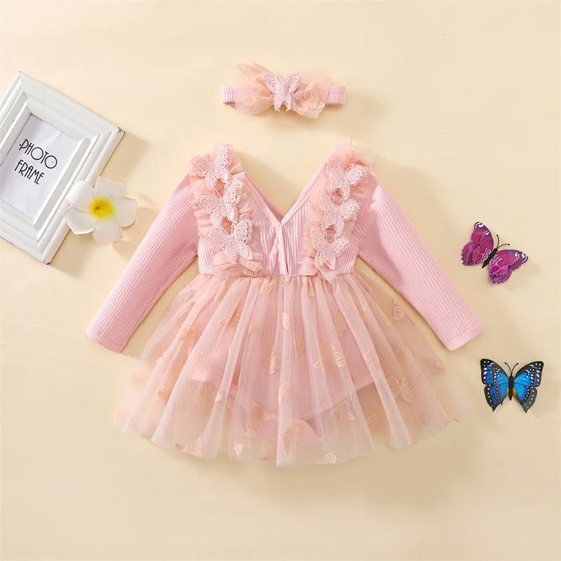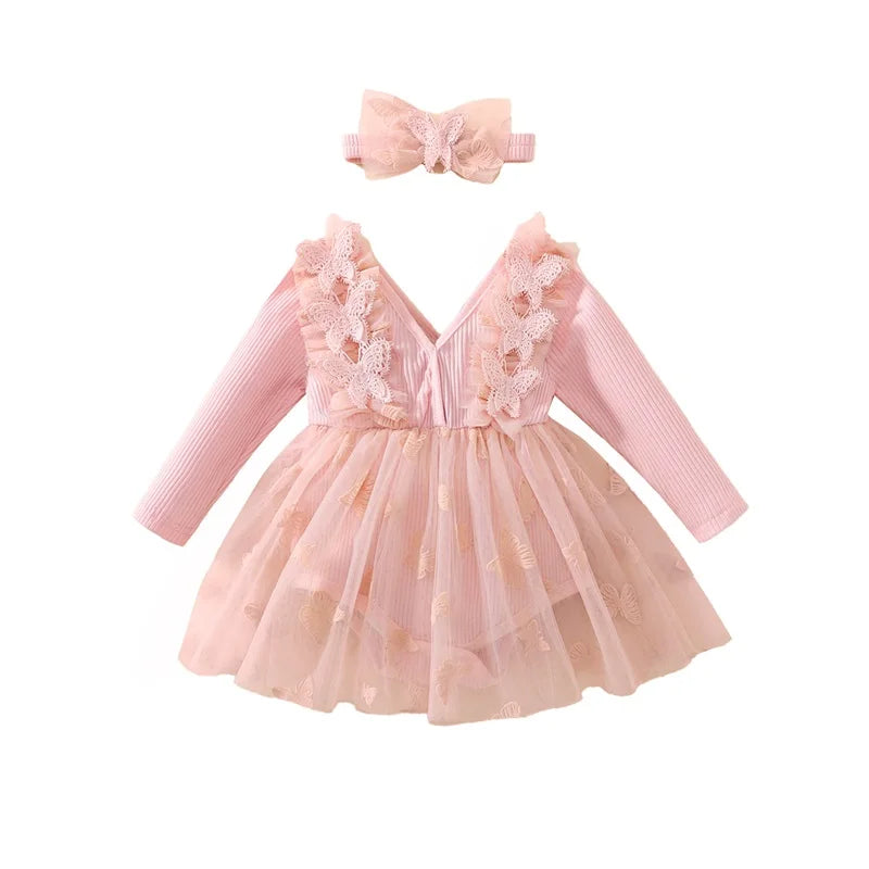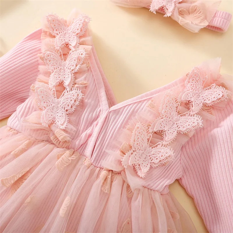 Baby Girl 2Pcs Fall Outfits Long Sleeve 3D Butterfly Romper Tulle Dress with Headband Set Infant Clothes