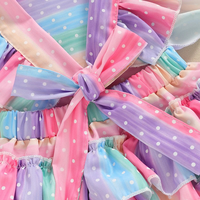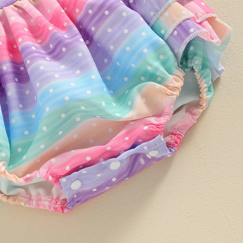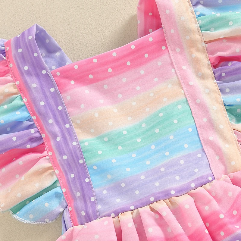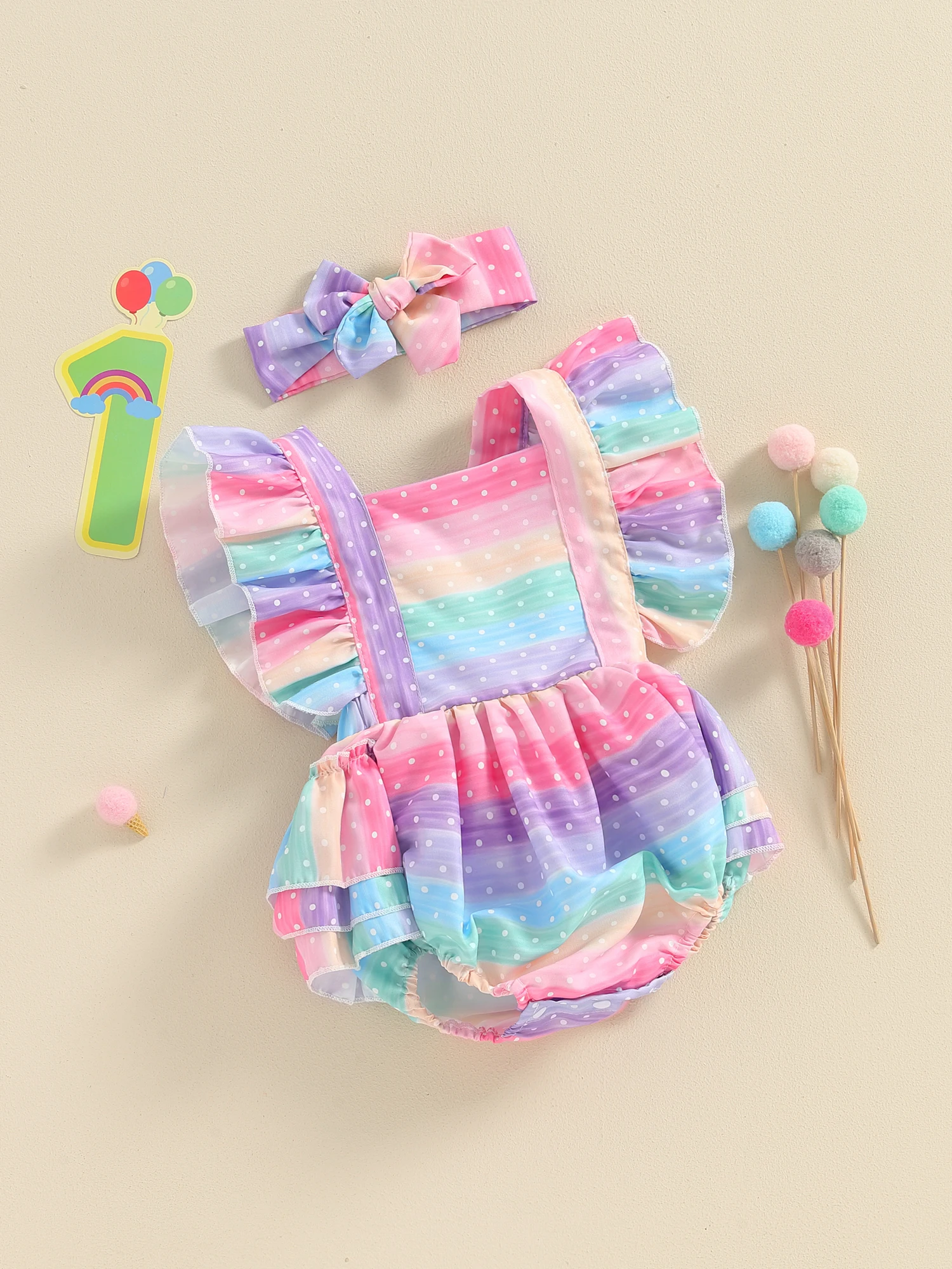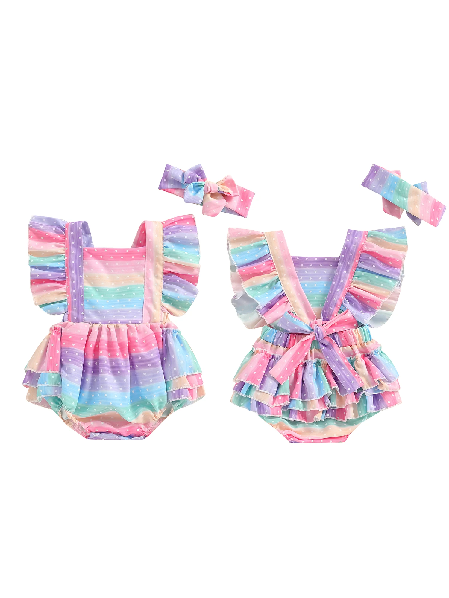 Baby girl romper dress with gradient rainbow stripe print, ruffles, square neckline, layered hemline, bottom buttons, and cute headband set, your little one will receive a lot of compliments when wearing it.