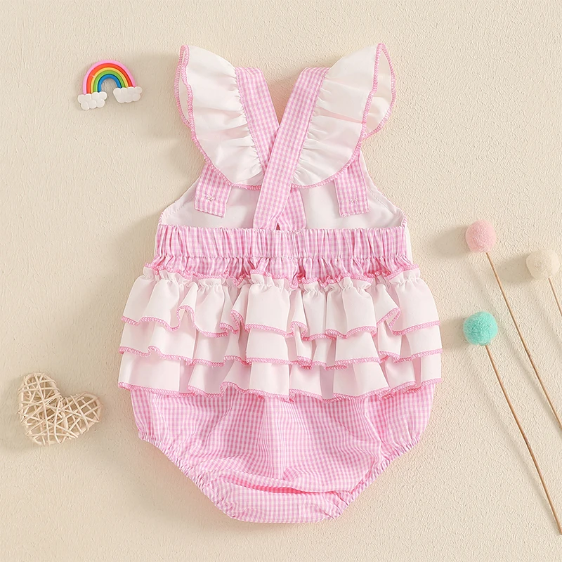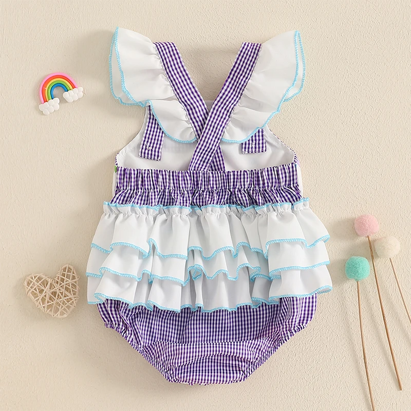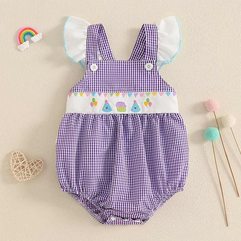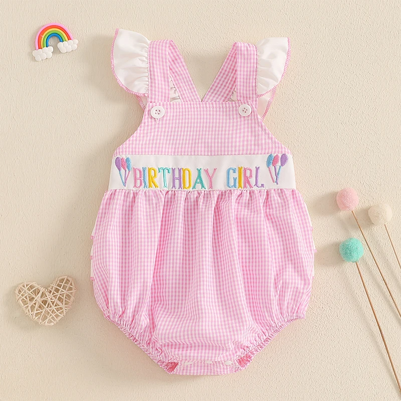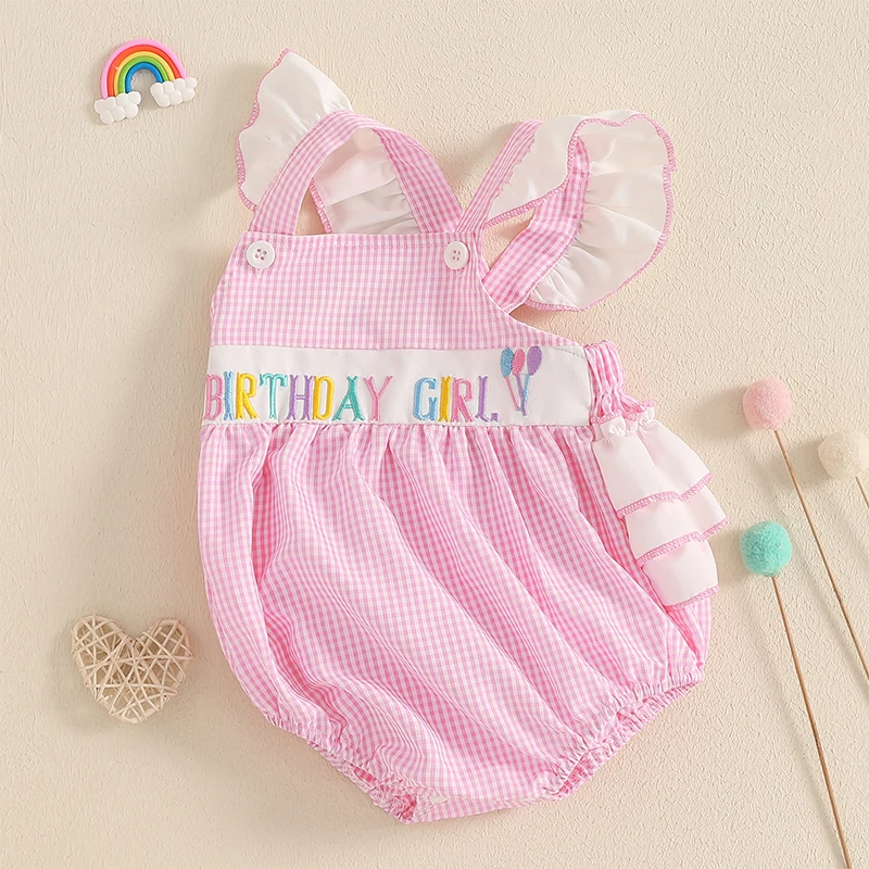 Baby Girls Rompers Birthday Clothes Plaid Letter Balloon Embroidery Ruffles Fly Sleeve Jumpsuits Bodysuits